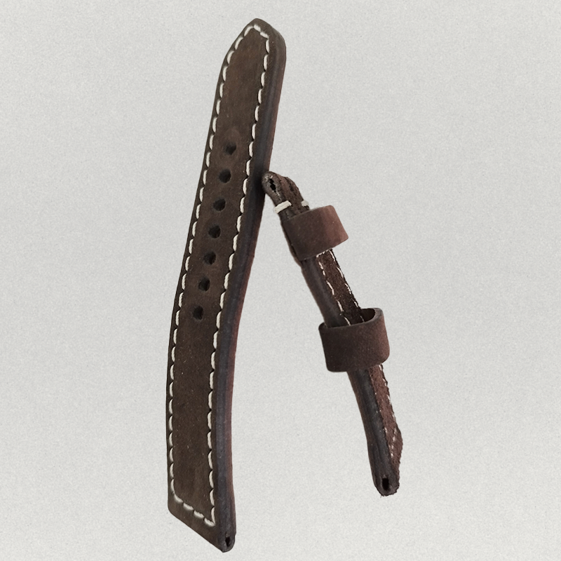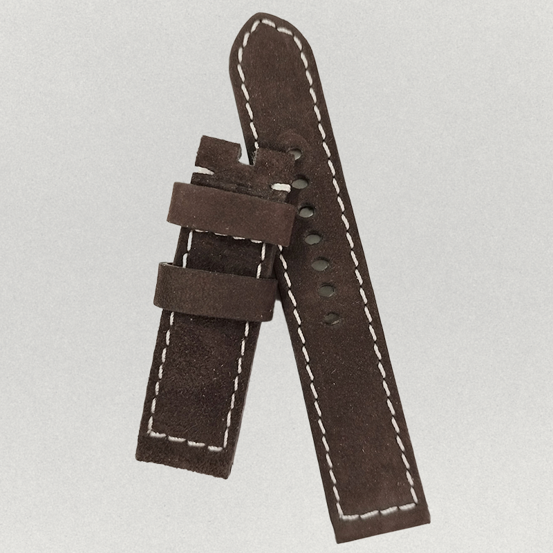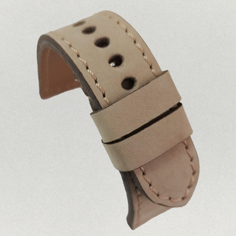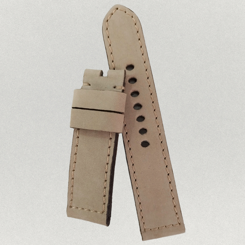 Nubuck cowhide leather strap, with leather interior, matte edges, and a fixed pin. Flexible and soft to the touch. Available in beige and brown colors.