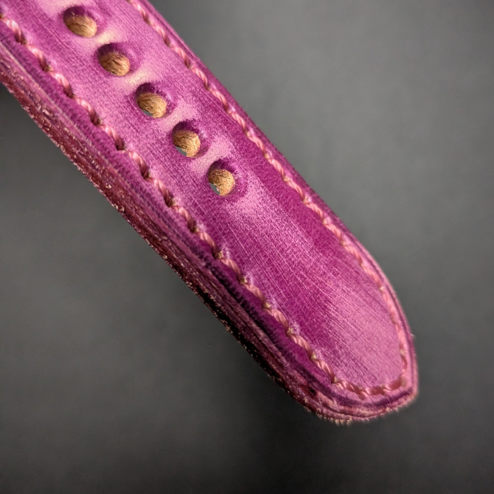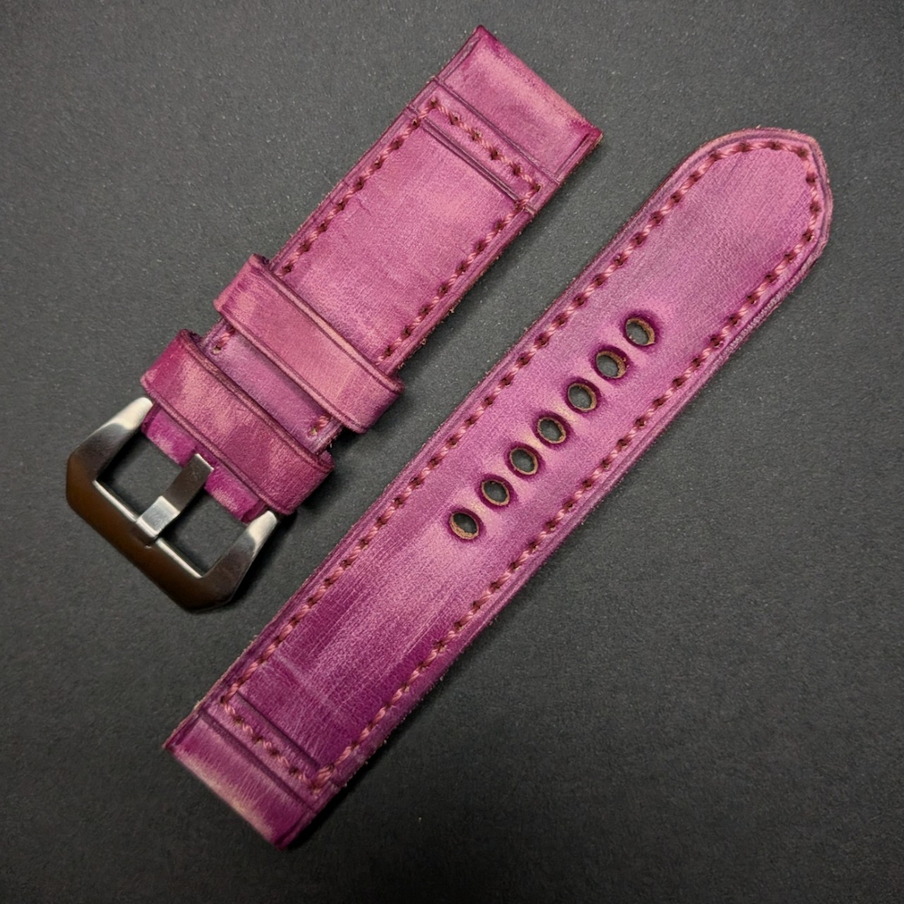 Vintage cowhide leather watch strap in purple. Handcrafted in our workshop in Ubrique – Spain. This watch strap can be customized to your liking. You can add your initial stamped on it or request it in other sizes by contacting us.