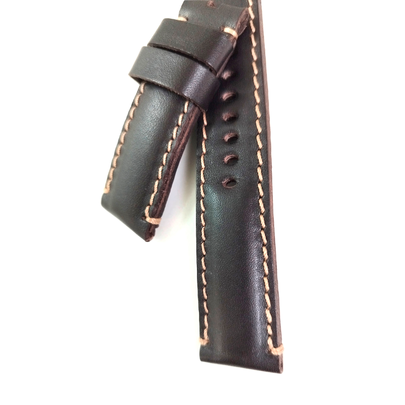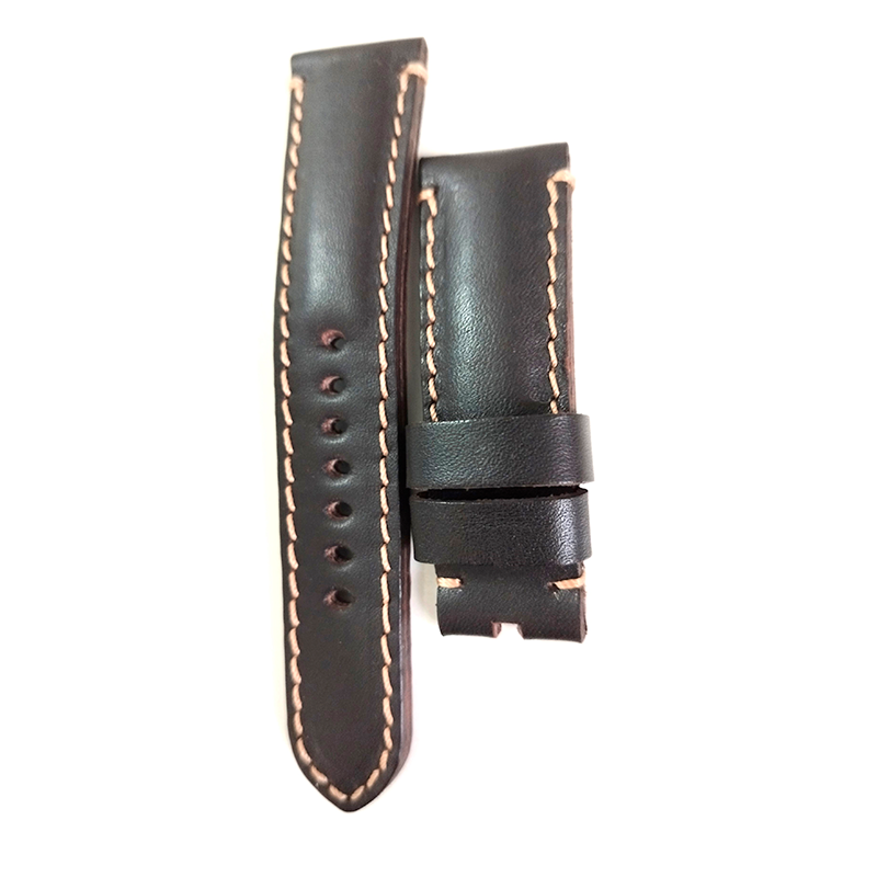 Double folded cowhide leather strap in chocolate color. Flexible texture, with padding and stitching on the sides.