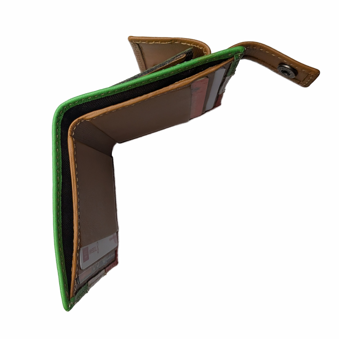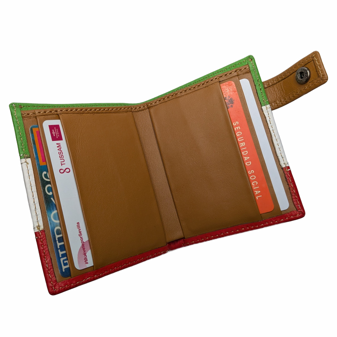 Dale un toque distintivo a tu estilo con esta cartera artesanal confeccionada en cuero vacuno de primera calidad. Su diseño está inspirado en los colores emblemáticos de Italia: verde, blanco y rojo, con un interior en un cálido tono marrón.