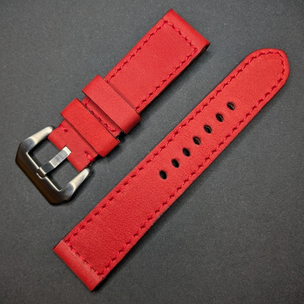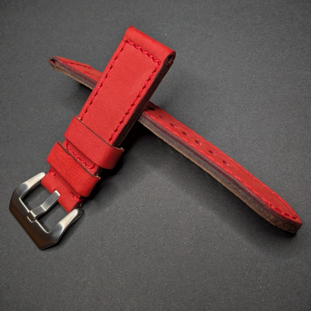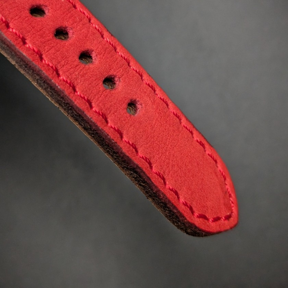 Correa artesanal elaborada en Nobuk de cuero vacuno en color rojo, un tono intenso y elegante que aporta personalidad y un toque distintivo al reloj. Su textura aterciopelada y suavidad al tacto hacen que resulte especialmente cómoda desde el primer día.