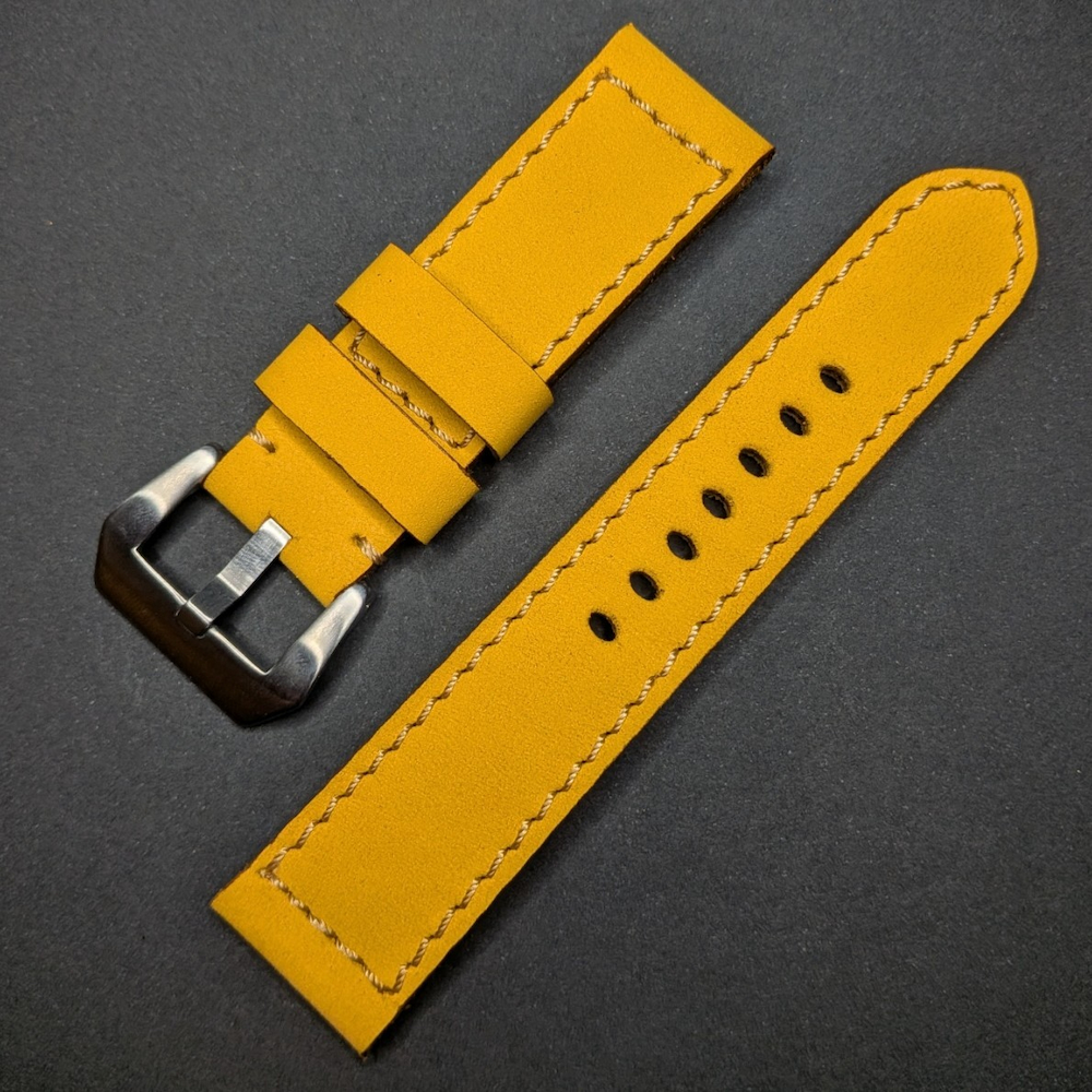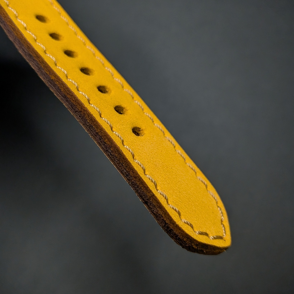 Correa artesanal confeccionada en Nobuk de cuero vacuno en color amarillo, un tono luminoso y original que aporta frescura y personalidad al reloj. Su acabado mate y textura suave y flexible ofrecen una sensación muy agradable al contacto con la piel.