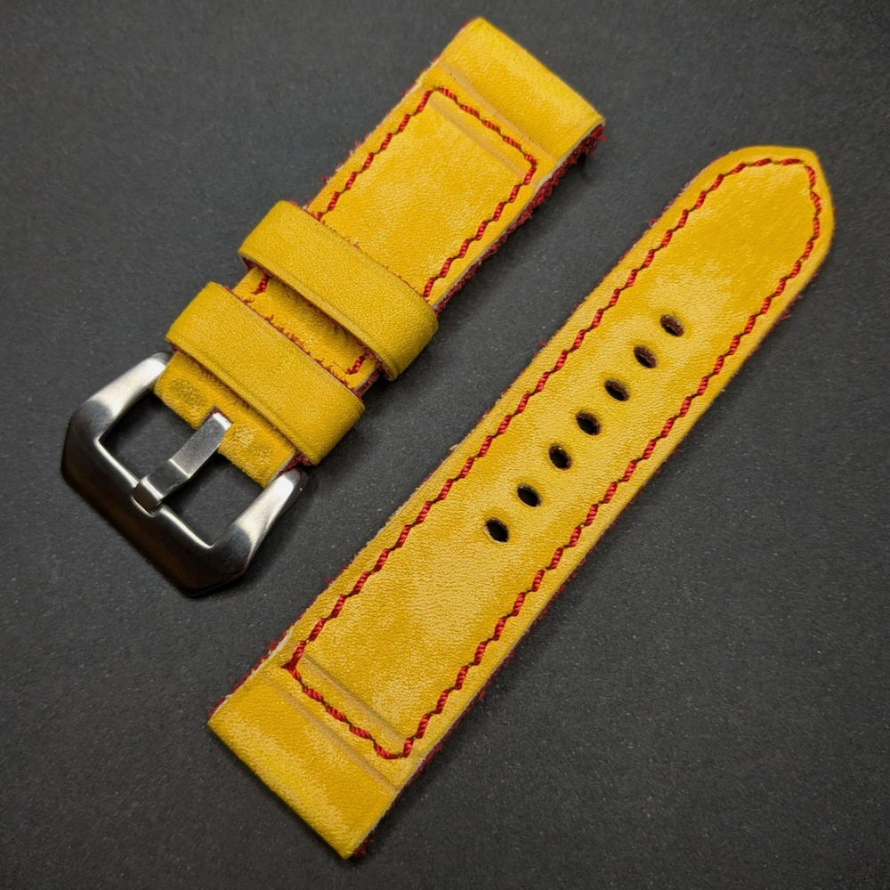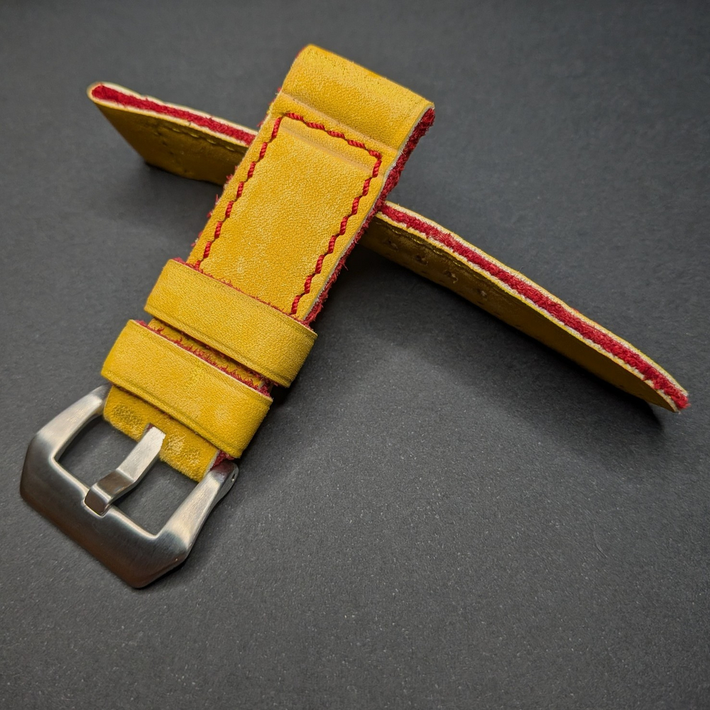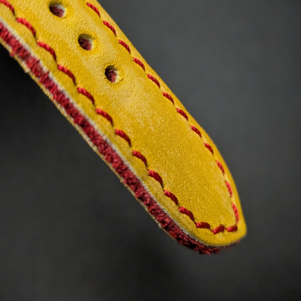 Está confeccionada en cuero vacuno de alta calidad, con exterior en color amarillo envejecido a mano, logrando un acabado vintage lleno de personalidad. El relleno interior en cuero rojo aporta contraste, profundidad y un detalle distintivo que se aprecia tanto en el canto como en el conjunto general de la correa.