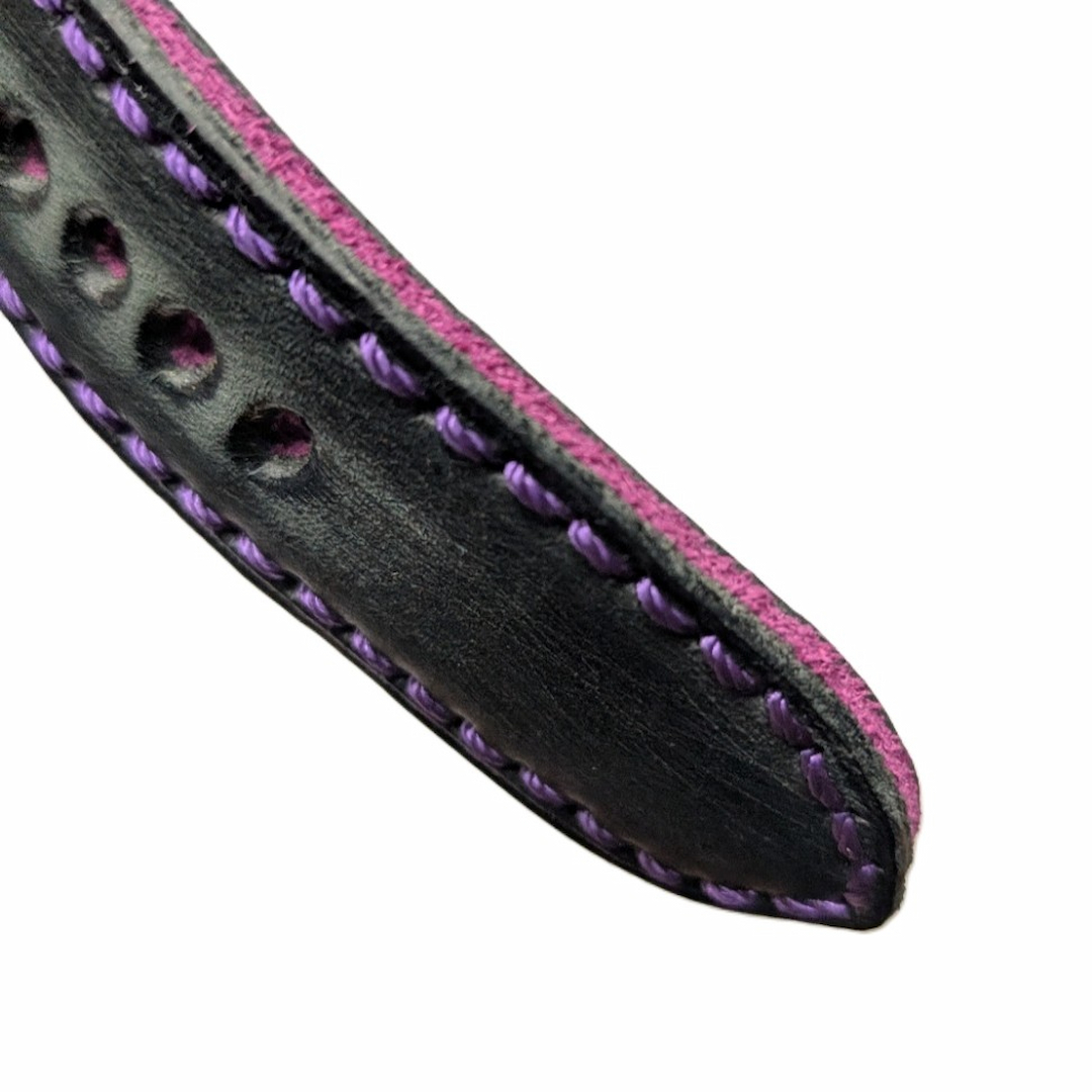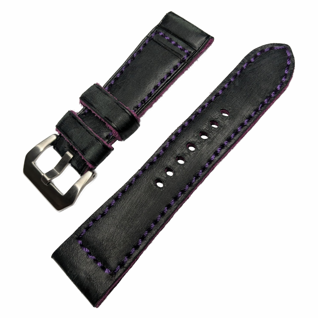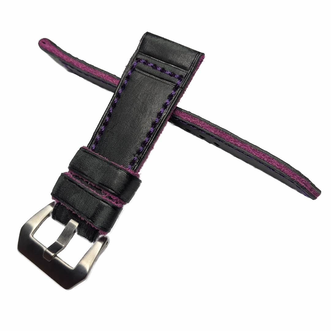 Correa de reloj elaborada con cuero vacuno de gran calidad, presentando un exterior negro tratado artesanalmente para conseguir un aspecto envejecido de estilo vintage y gran carácter. El interior, en color morado, añade un contraste elegante, mayor profundidad visual y un rasgo diferencial visible tanto en el borde como en la apariencia global de la correa.