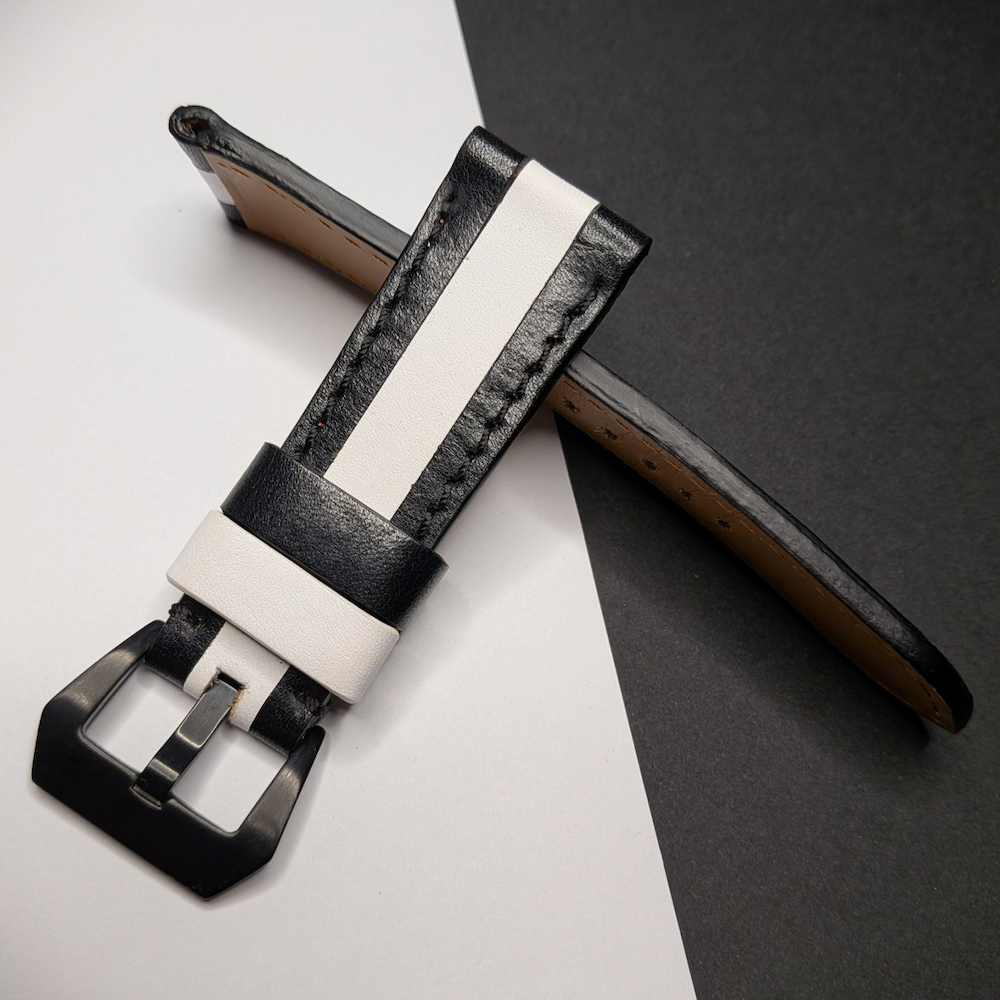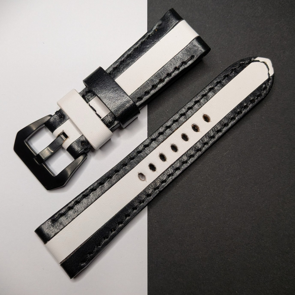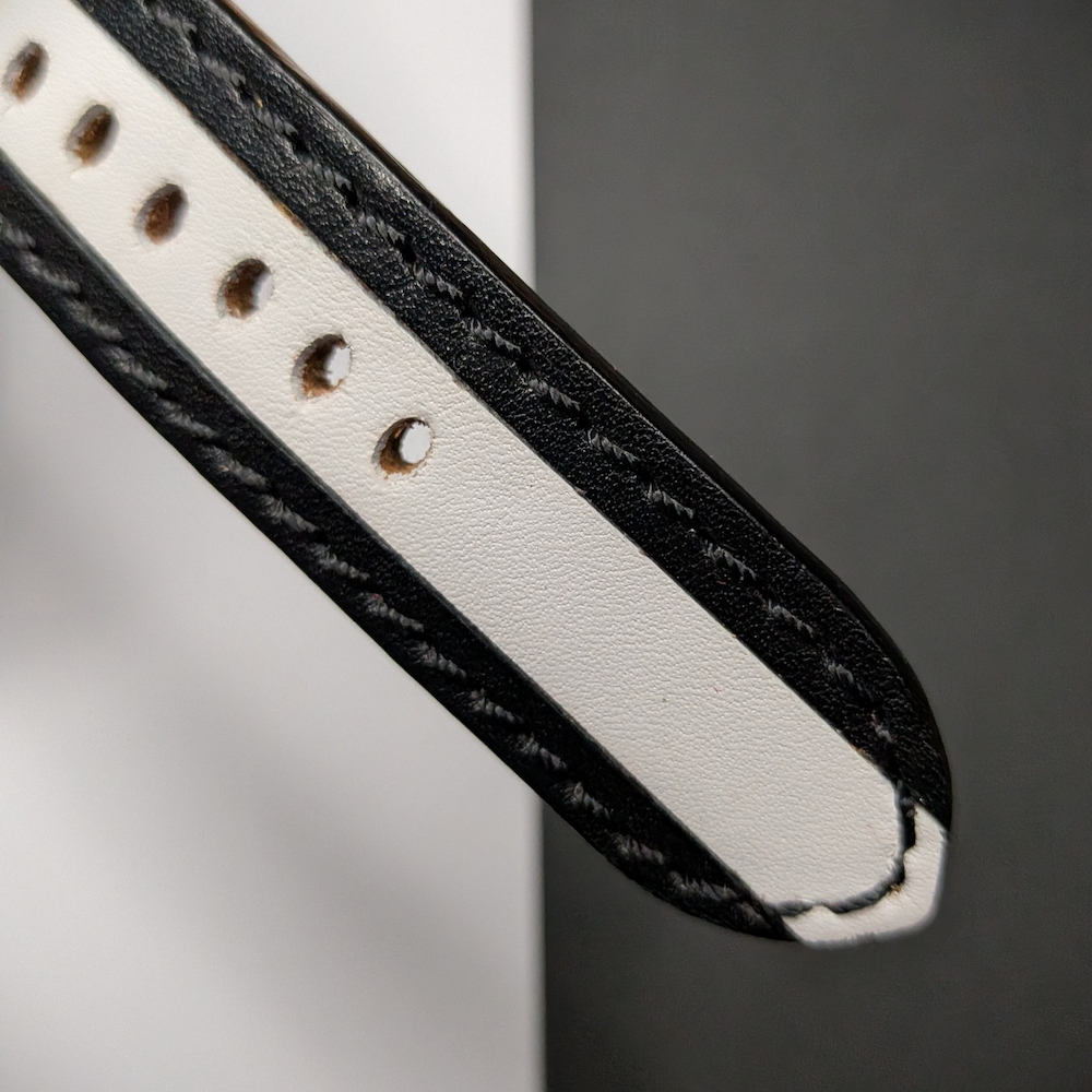 Elaborada a mano en nuestro taller de Ubrique (Cádiz), está confeccionada en cuero vacuno de primera calidad, cuidadosamente seleccionado y trabajado para garantizar durabilidad y confort. Su diseño distintivo presenta dos franjas en negro y una franja central en blanco, un guiño al mundo del motor clásico y a la estética racing atemporal.