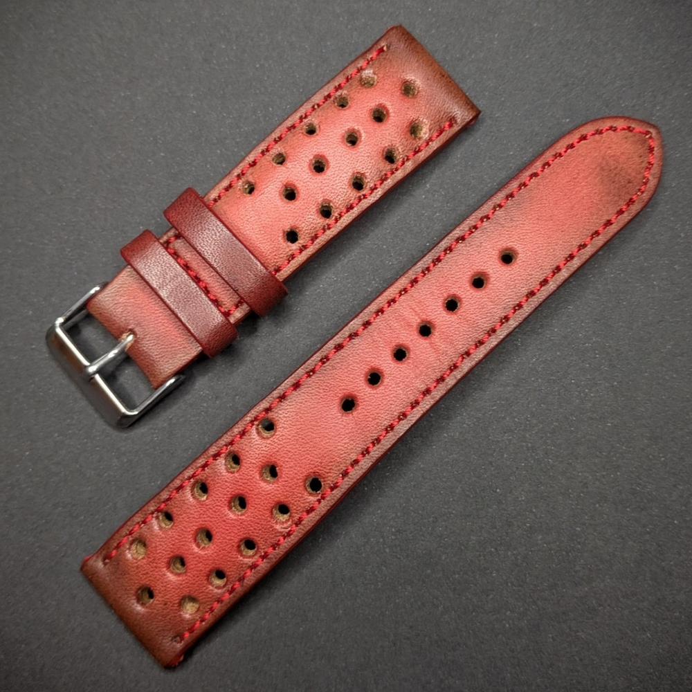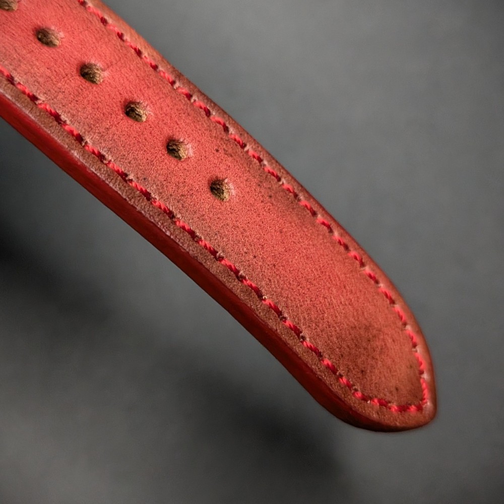 Correa de reloj artesanal estilo racing en un vibrante color rojo, hecha a mano en nuestro taller en Ubrique, Cádiz. Confeccionada en cuero vacuno de alta calidad, cada pieza es pintada a mano por nuestro artesano para lograr un acabado único e inigualable.